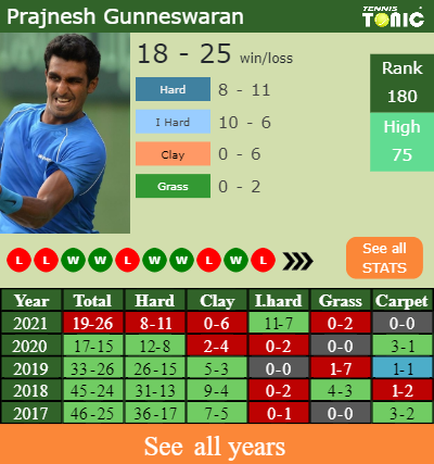 Gunneswaran has an overall 19-26 win-loss record in 2021, 11-7 on indoor hard courts (See FULL STATS).