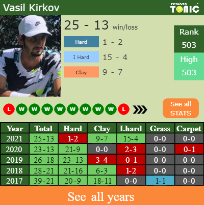 Kirkov has a compiled 25-13 win-loss record in 2021, 15-4 on indoor hard courts (See FULL STATS).