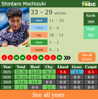 Mochizuki has a winning record in the last 4 years having won 56% of his matches (67-52). 3-6 on indoor hard courts in 2021. Regarding his performance on the same surface of this event, Mochizuki has a composed3-6 record in the last 4 years on indoor hard courts.