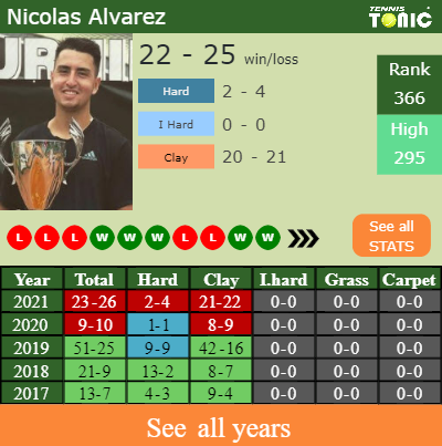 Alvarez has a composed 23-26 win-loss record in 2021, 21-22 on clay (See FULL STATS).