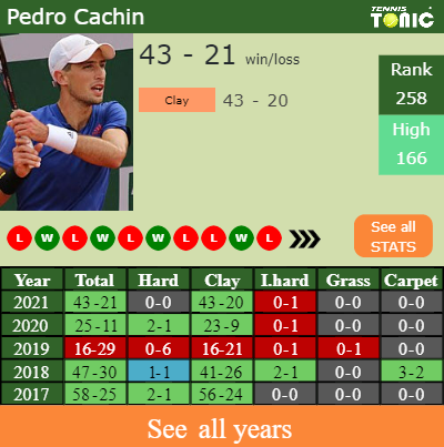 Cachin has a compiled 43-21 win-loss record in 2021, 43-20 on clay (See FULL STATS).