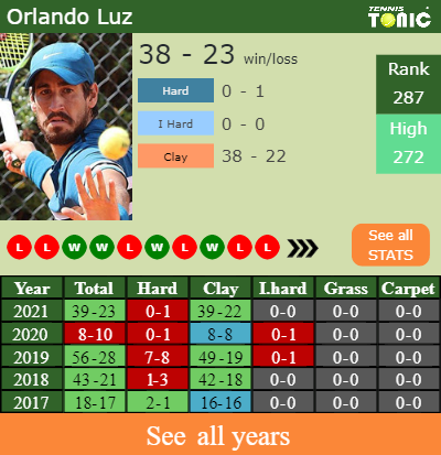 Luz has an aggregate 39-23 win-loss record in 2021, 39-22 on clay (See FULL STATS).
