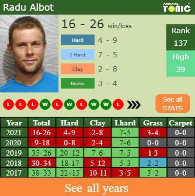 Radu has a compiled 16-26 win-loss record in 2021, 7-5 on indoor hard courts (See FULL STATS).