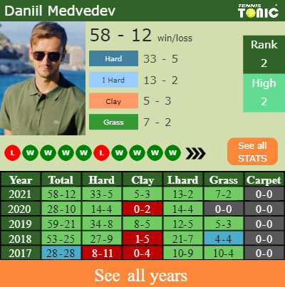 Medvedev has a compiled 58-12 win-loss record in 2021, 13-2 on indoor hard courts (See FULL STATS).