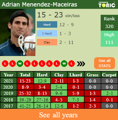 The Spaniard has a compiled 15-23 win-loss record in 2021, 12-9 on hard (See FULL STATS).