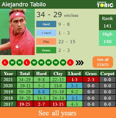 Alejandro has a composed 34-29 win-loss record in 2021, 9-8 on hard (See FULL STATS).