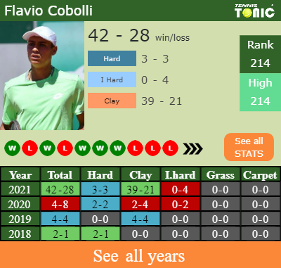 Flavio has an aggregate 42-28 win-loss record in 2021, 3-3 on hard (See FULL STATS).