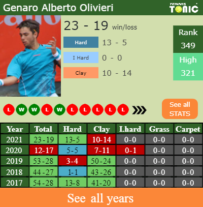 Genaro has an overall 23-19 win-loss record in 2021, 10-14 on clay (See FULL STATS).