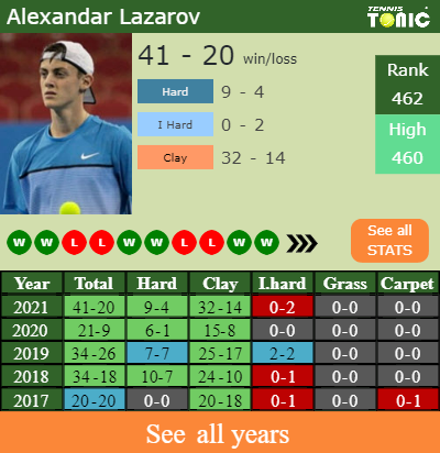 Lazarov has a compiled 41-20 win-loss record in 2021, 9-4 on hard (See FULL STATS).