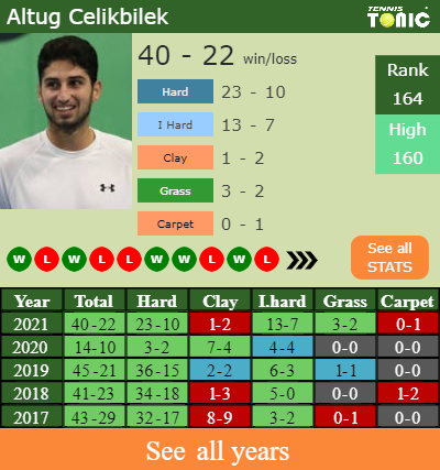 This will be the 2nd time that Altug Celikbilek and Alexandar Lazarov play each other. The head to head is 1-0 for Lazarov (see full H2H stats), but they have never competed against each other on hard.