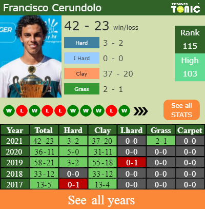 Cerundolo has a fantastic match record in the last 6 years having won 71% of his matches (201-81). 37-20 on clay in 2021. In connection with his performance on the same surface of this tournament, Cerundolo has a compiled188-74 match record in the last 6 years on clay.