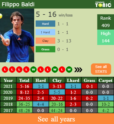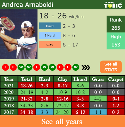 Arnaboldi has an aggregate 18-26 win-loss record in 2021, 2-3 on hard (See FULL STATS).