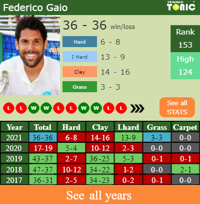 Federico has a composed 36-36 win-loss record in 2021, 13-9 on indoor hard courts (See FULL STATS).