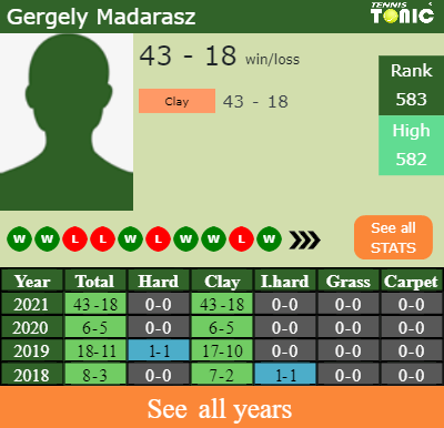 Madarasz has an overall 43-18 win-loss record in 2021, 43-18 on clay (See FULL STATS).