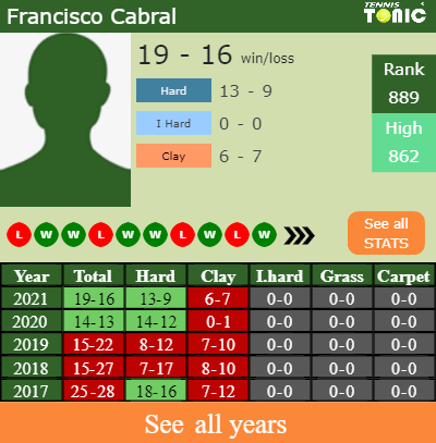 Francisco has a composed 19-16 win-loss record in 2021, 6-7 on clay (See FULL STATS).