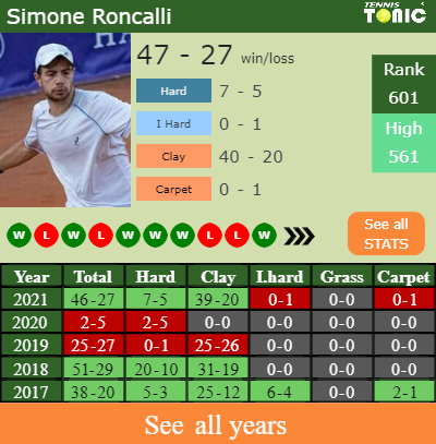 Talking about his overall career, Roncalli has an overall 231-170 record. He has a positive 179-128 record on clay.