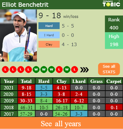 Elliot has an overall 9-18 win-loss record in 2021, 4-13 on clay (See FULL STATS).