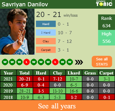 Danilov has an aggregate 20-21 win-loss record in 2021, 10-7 on indoor hard courts (See FULL STATS).