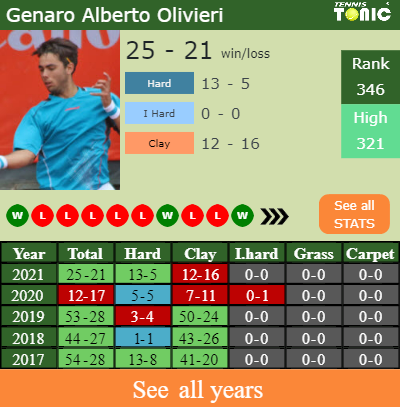 Genaro has an aggregate 25-21 win-loss record in 2021, 12-16 on clay (See FULL STATS).