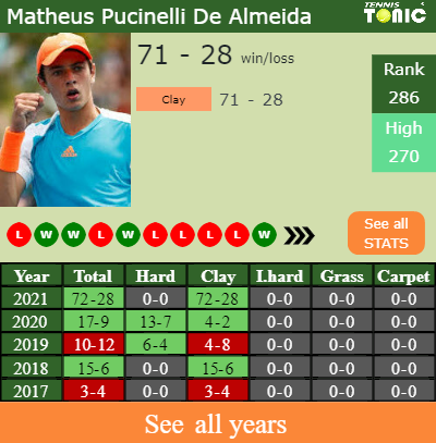 Pucinelli De Almeida has a composed 72-28 win-loss record in 2021, 72-28 on clay (See FULL STATS).
