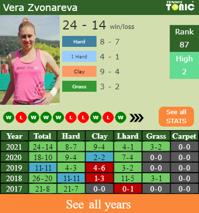Zvonareva has a favorable record in the last 10 years having won 59% of her matches (123-85). 4-1 on indoor hard courts in 2021. Talking about her performance on the same surface of this tournament, Zvonareva has a compiled 26-14 win-loss record in the last years on indoor hard courts.