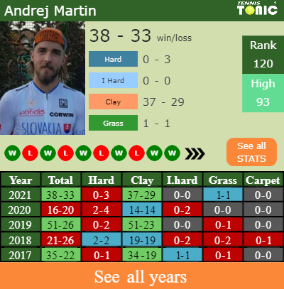 Andrej has an aggregate 38-33 win-loss record in 2021, 37-29 on clay (See FULL STATS).