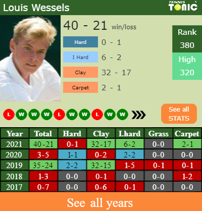 Wessels has an aggregate 40-21 win-loss record in 2021, 32-17 on clay (See FULL STATS).