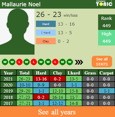 Mallaurie has an aggregate 26-23 win-loss record in 2021, 13-5 on indoor hard courts (See FULL STATS).