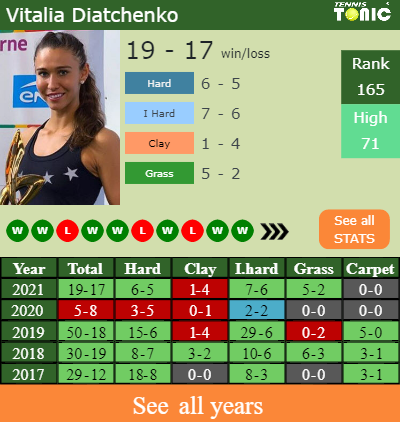 Diatchenko has a compiled 19-17 win-loss record in 2021, 7-6 on indoor hard courts (See FULL STATS).
