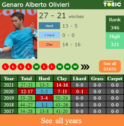 Alberto has an aggregate 27-21 win-loss record in 2021, 14-16 on clay (See FULL STATS).