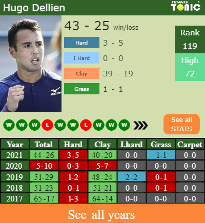 Dellien has a solid win-loss record in the last 10 years having won 65% of his matches (395-213). 40-20 on clay in 2021. In connection with his performance on the same surface of this competition, Dellien has an overall 382-182 record in the last years on clay.