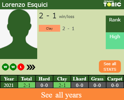 Talking about his overall career, Esquici has an overall 2-1 record. He has a flat 0-0 record on hard.