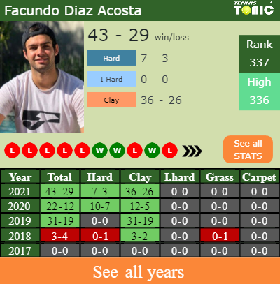 See updated oddsAs per the initial odds, Facundo Diaz Acosta is the pick to win this match.