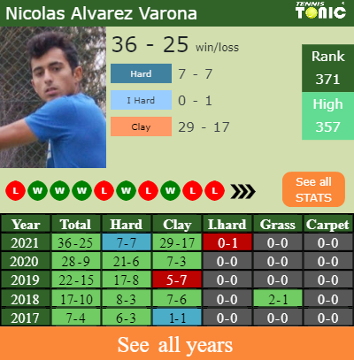 Alvarez Varona has an aggregate 36-25 win-loss record in 2021, 7-7 on hard (See FULL STATS).