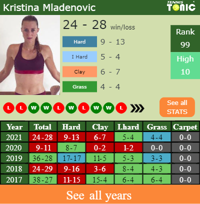 Mladenovic has an overall 24-28 win-loss record in 2021, 5-4 on indoor hard courts (See FULL STATS).