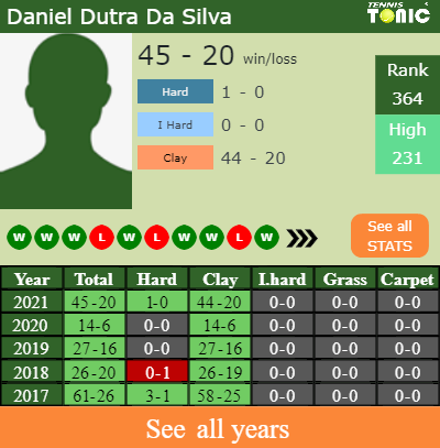 Dutra Da Silva has a solid win-loss record in the last 10 years having won 63% of his matches (346-201). 1-0 on hard in 2021. In connection with his performance on the same surface of this competition, Dutra Da Silva has a composed 20-16 match record in the last years on hard.