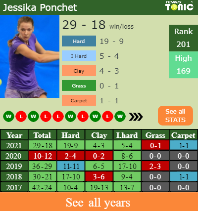 Ponchet has an overall 29-18 win-loss record in 2021, 5-4 on indoor hard courts (See FULL STATS).