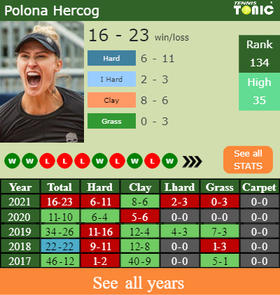 Hercog has a positive match record in the last 10 years having won 55% of her matches (247-204). 2-3 on indoor hard courts in 2021. Regarding her performance on the same surface of this tournament, Hercog has a composed 10-13 win-loss record in the last years on indoor hard courts.