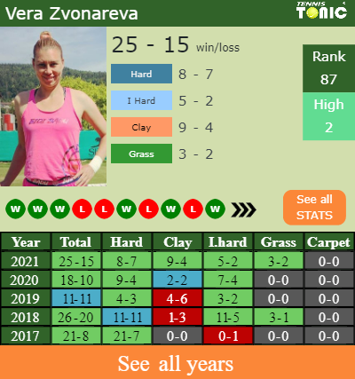 Zvonareva has a positive record in the last 10 years having won 59% of her matches (124-86). 5-2 on indoor hard courts in 2021. Talking about her performance on the same surface of this competition, Zvonareva has an aggregate 27-15 win-loss record in the last years on indoor hard courts.