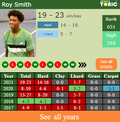 Roy has an overall 19-23 win-loss record in 2021, 14-16 on hard (See FULL STATS).