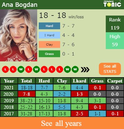 Bogdan has a solid record in the last 10 years having won 63% of her matches (298-178). 4-4 on indoor hard courts in 2021. In connection with her performance on the same surface of this competition, Bogdan has a composed 39-30 match record in the last years on indoor hard courts.