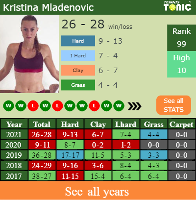Kristina has an overall 26-28 win-loss record in 2021, 7-4 on indoor hard courts (See FULL STATS).
