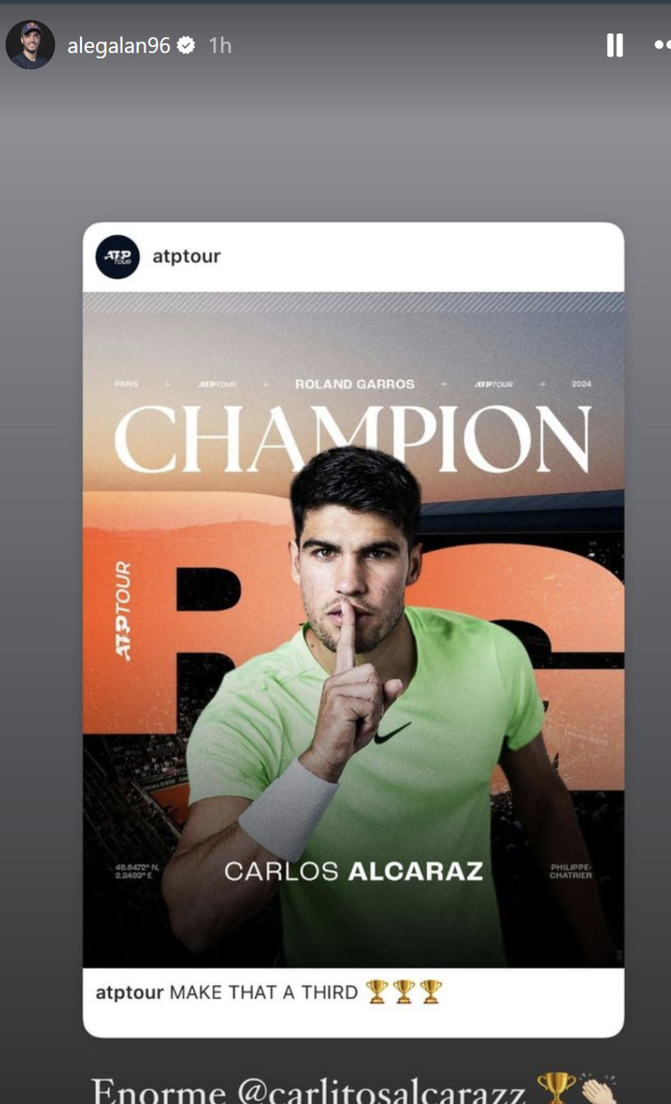 Galan shared Alcaraz’s celebratory post on his Instagram story, adding his own message of praise: “Enorme @carlitosalcaraz.” This heartfelt acknowledgment from one Spanish sports star to another highlights the camaraderie and mutual respect within the sports community.