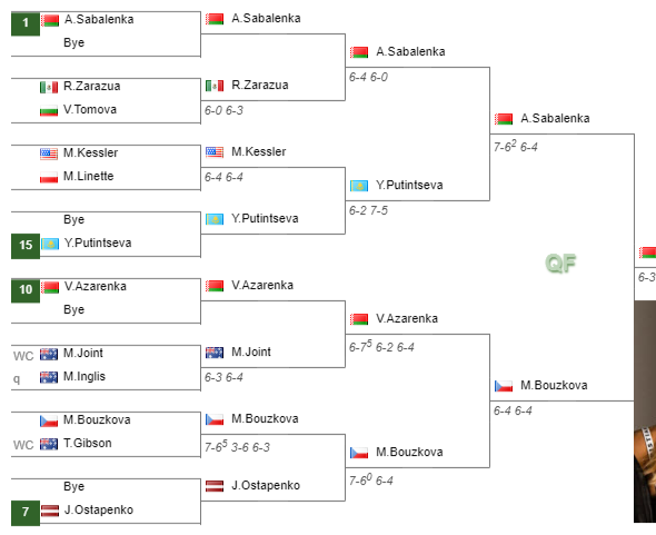LWWWWLWWWW Now ranked no.1, Aryna played her last match on the 4th of January when she beat Mirra Andreeva 6-3 6-2 in the semifinal in Brisbane (draw).