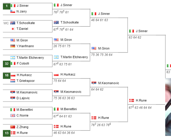 - Jannik SinnerSinner – Alex De MinaurDe Minaur (6-3 6-2 6-1)