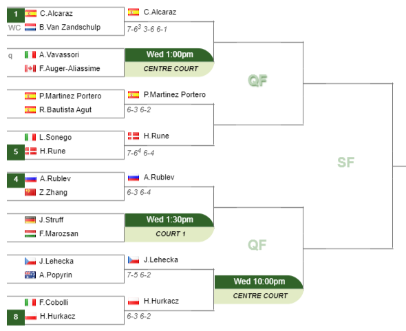 - Carlos AlcarazAlcaraz – Botic Van De ZandschulpVan De Zandschulp (7-6(3) 3-6 6-1)