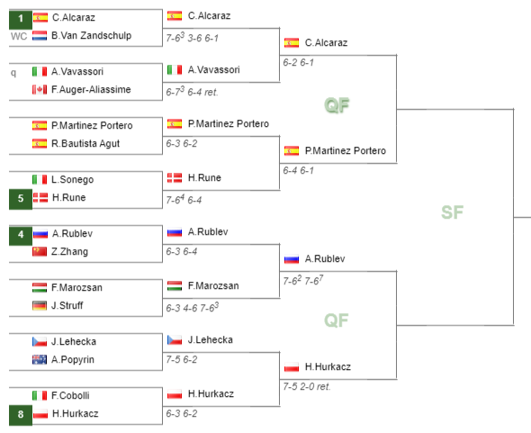 Carlos Alcaraz will square off with the world no.44 Pedro Martinez Portero in the quarter. Their record is 3-0 for Alcaraz.