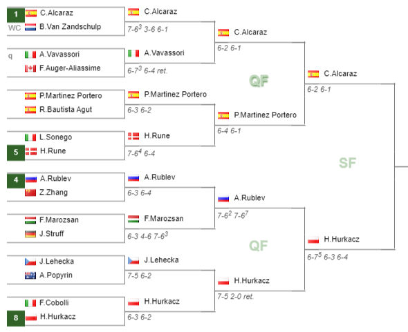 Carlos Alcaraz will come up against the world no.21 Hubert Hurkacz in the semifinal. Their head to head is 3-0 for Alcaraz.