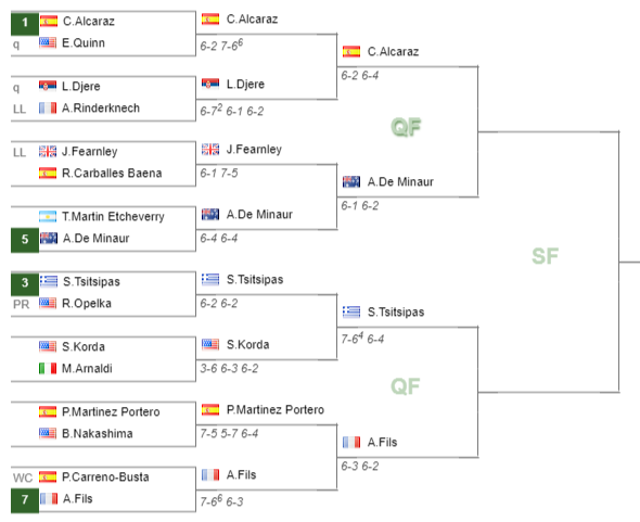 Carlos Alcaraz will take on the world no.7 Alex De Minaur in the quarter. Their record is 3-0 for Alcaraz.