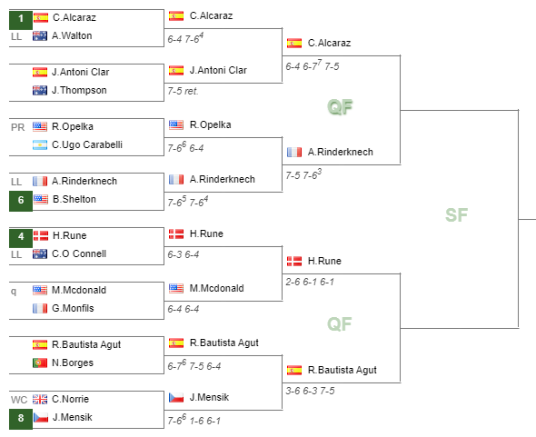 Arthur Rinderknech will square off with the world no.2 Carlos Alcaraz in the quarter. The head to head is 2-0 for Alcaraz.